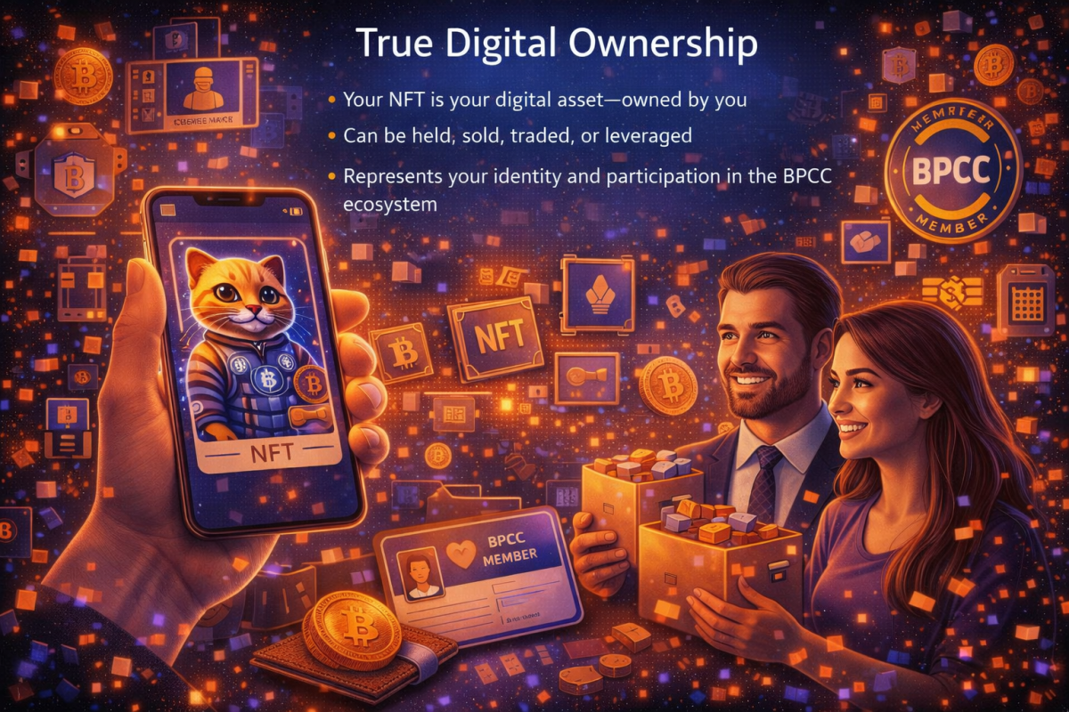 Your NFT is your digital asset—owned by you Can be held, sold, traded, or leveraged Represents your identity and participation in the BPCC ecosystem
